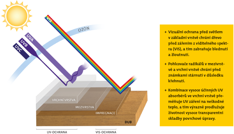 Receptem na úspěch nové technologie CCT je jedinečný balíček ochrany před světlem, který vyvinul tým v laboratoři ADLER vedený manažerem vývoje Dr. Simonem Leimgruberem. „Zkombinovali jsme různé UV absorbéry tak, abychom dosáhli nejlepší možné ochrany v celém rozsahu vlnových délek viditelného a neviditelného záření,“ říká Dr. Leimgruber. To je důležité zejména u dubových oken: běžné světelné stabilizátory chrání jen před UV zářením – ale proti obávanému vyblednutí dubu nic nezmohou. Nová vysoce výkonná ochrana před světlem od ADLER na druhé straně velmi cíleně pohlcuje i části viditelného světelného spektra – zabraňuje jak žloutnutí smrku, borovice či jídle, tak vyblednutí dubu. Balíček ochrany před světlem má jen minimální samozabarvení – autentický, vysoce kontrastní charakter dřeva je zachován až po póry.