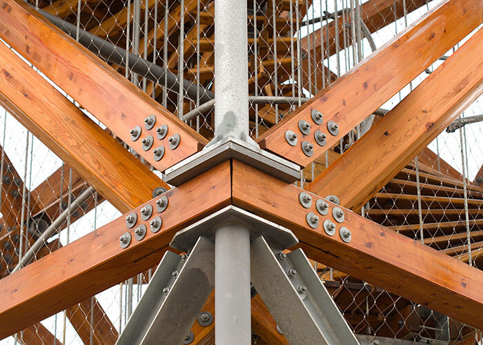Konstrukce (z příhradovin A a B) byla skládána modulově, jeden modul = segment. První segment byl složen přímo na betonové desce, další segmenty byly smontovány na staveništi a osazeny jeřábem na předešlý. Vynechané diagonály byl dodatečně připojeny. Prstenec byl zavěšen a zvednut s posledním segmentem konstrukce B. Na něj byly postupně upevňovány vnější táhla s příslušně umístěnými přípravky pro osazení schodišťového dílce a následně odspodu nahoru bylo doděláno schodiště.