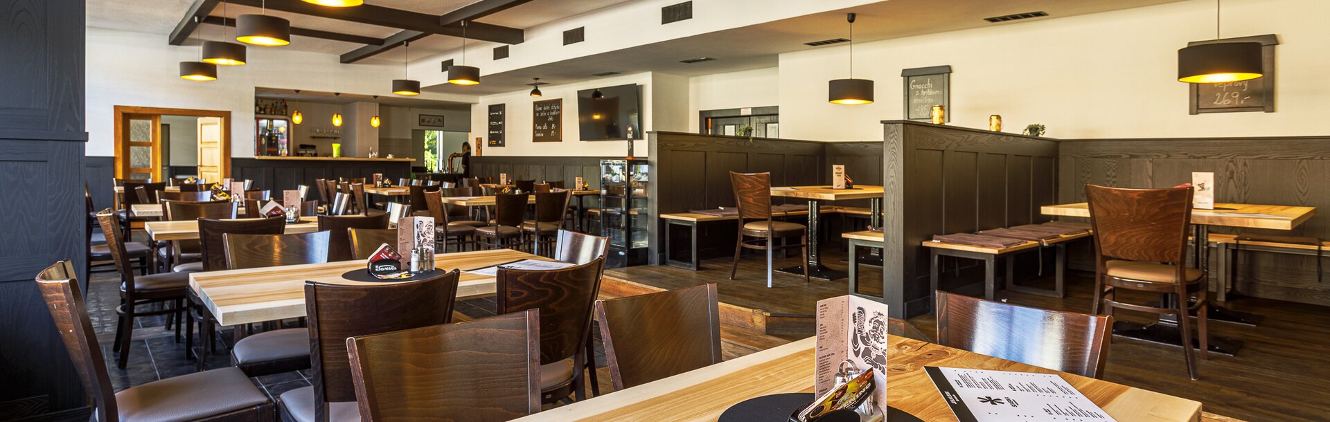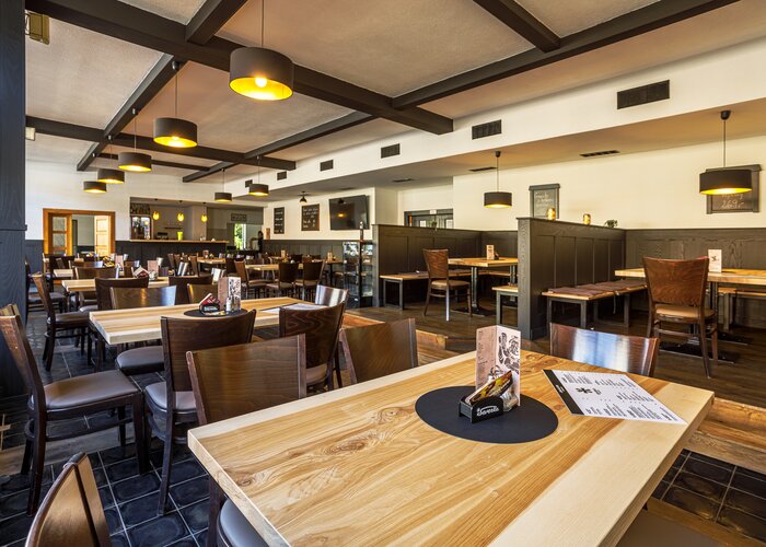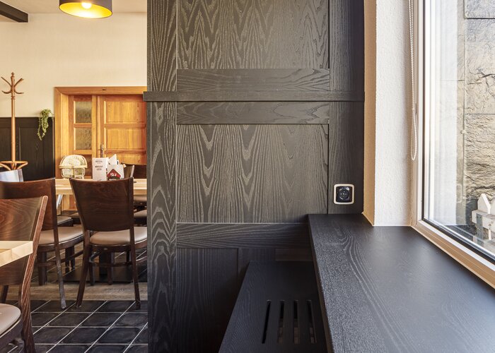 Truhlářství Hilfe s.r.o. realizovalo interiér restaurace v Kraslicích s mořidlem Arova Flex v odstínu Lava a ekologickým, prémiovým lakem Bluefin Terra-Diamond v matném stupni lesku G5.