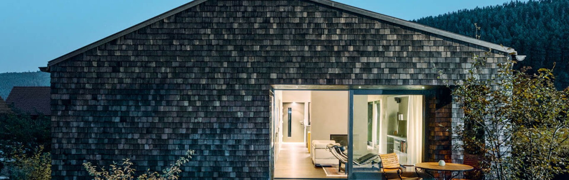 Moderní dům ve Schwarzwaldu v údolí Tonbach je místem odpočinku. Malý přízemní obytný dům na louce, která byla původně osázena ovocnými stromy, pasuje do okolní krajiny jako „ulitý“. Při bližším pohledu na sebe upozorní právě svojí nenápadností. Hlavní princip: obložení fasády z jednoduchých, tmavých smrkových šindelů. Reakce dvojice architektů Klumpp+Klumpp BDA na tradiční fasády v regionu a na černě natřený včelín, který zde stál dříve. Na 90 metrech čtverečných obytné plochy působí schwarzwaldský domek svou jednoduchou formou neotřele. Prostor najdete v nejmenší chatičce – díky praktickému návrhu obou architektů je zde místo pro otevřený jídelní a obytný prostor, dvě ložnice, koupelnu a dokonce i saunu.