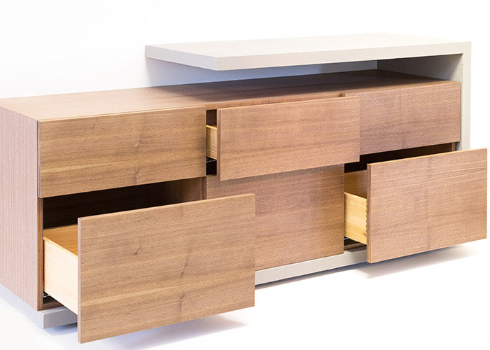 Tolik k designovému kousku s betonovým orámováním, které mu dodává šmrnc a jedinečnost. Je v něm vložený klasický příborník: s jednoduchým, avšak ručně vyrobeným ořechovým tělem. Šest zásuvek nemá úchytky a o otevírání a zavírání se postará mechanismus, který umožňuje zásuvky zavřít "konečkem prstu". Příborník přímo láká, abyste se ho dotkli, protože jemně broušený ořech upravený pomocí oleje ADLER Legno-Öl vytváří povrch velmi příjemný na dotek. Zásuvky jsou vyrobeny z nejkvalitnějších materiálů: ručně spojované, přední část zásuvek je vyrobena z jilmové dýhy, tělo zásuvek z jilmového masivu. Řemeslná dokonalost zvenku i zevnitř, zážitek pro oči a dokonalý pocit na dotek – každý milovník dřeva si přijde na své!