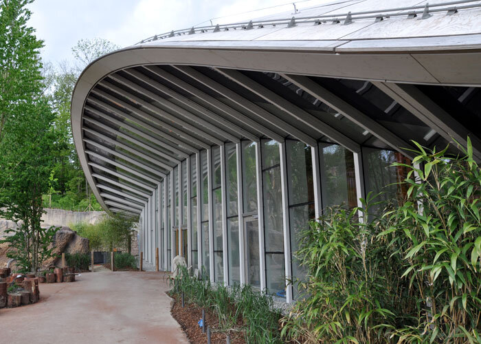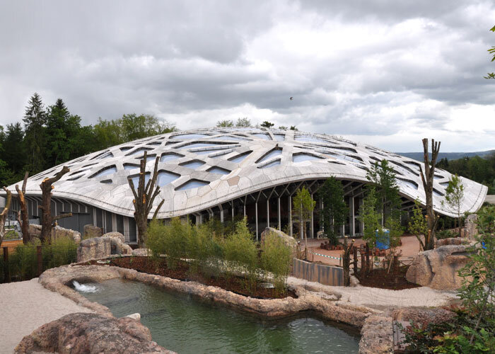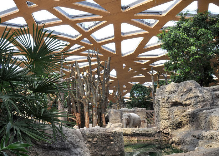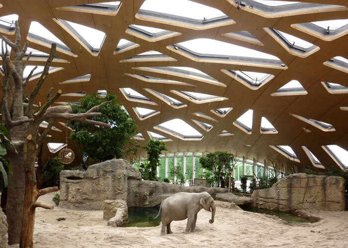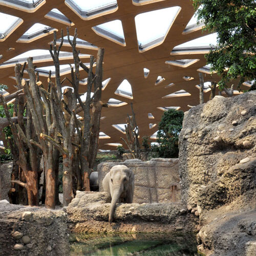 Výchozí situace byla vzrušující výzvou pro švýcarské studio Markus Schietsch Architekten, které vyhrálo mezinárodní veřejnou soutěž k tomuto projektu. Pro návrh formy sloního domova založeného na práci se dřevem se architekti nechali inspirovat obrazy z rostlinné a zvířecí říše. Mimořádným prvkem jejich přírodního obydlí, které bylo dokončeno v červnu 2014, je střecha o rozloze 6 800 metrů čtverečných, vyrobená z třívrstvých desek ze smrkového dřeva. Navzdory své velikosti zapadá plošně zakřivená dřevěná střecha výborně do okolní krajiny. Lesní porost a stavba tvoří vzájemnou symbiózu; v popředí je ničím nerušený přírodní zážitek – pro člověka i pro zvířata.