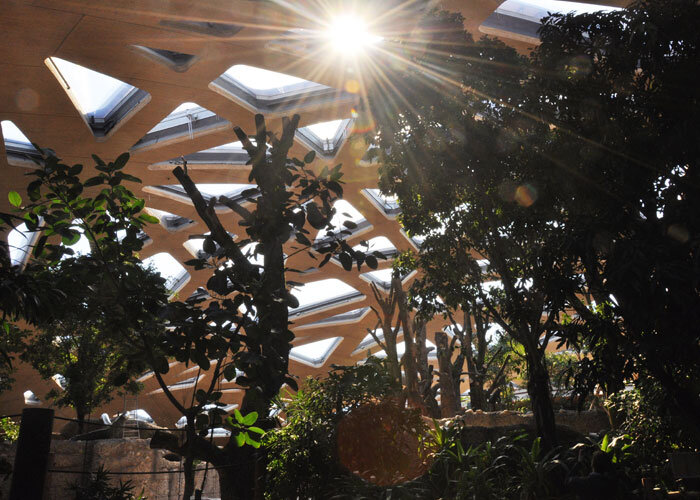 Díky síťované transparentní konstrukci střechy se nechce nikomu ani věřit, že tato na pohled lehce se vznášející střecha o rozpětí 80 metrů je ve skutečnosti velmi těžká – podobně jako obyvatelé tohoto příbytku, kteří se i přes svoji tunovou zátěž procházejí po svém novém domově lehkým krokem.