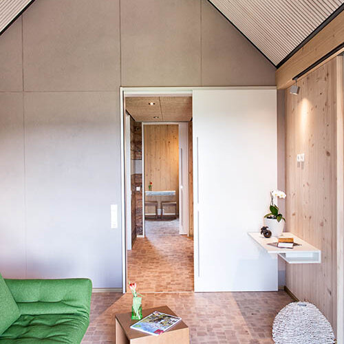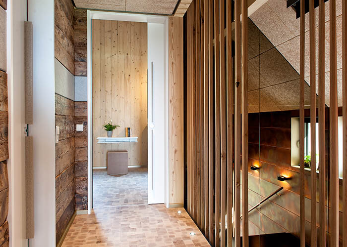 Dřevo, kam se podíváte: na obkladech fasád, kterým dává efekt lazury ADLER Lignovit Platin elegantní, šedohnědý lesk; na podlaze - naolejovaný buk; na vnitřních stěnách douglaska, bílá jedle a borovice přímořská, které chrání ADLER Lignovit Interior UV100 před zežloutnutím. Dřevo lze nalézt i na místech, kde byste ho hned na první pohled nečekali: police z dřevěných panelů vestavěné ve stěně vypadají jako normální kov - ale ve skutečnosti jsou upraveny ADLER Brilliant-Metallic, který jim dodávají vzhled pravého zlata. Televizní panel působí opačným efektem, jako kdyby byl potažený kůží - účinek, který Boschert dosáhl produktem ADLER-Reißlack. A stěny v kuchyni a v ložnicích se zdají být sice betonové, ale ve skutečnosti jsou vytvořeny s ADLER Betoneffekt. Boschert přirozeně použil dřevo i v kuchyni - na skříňky a jídelní stůl.