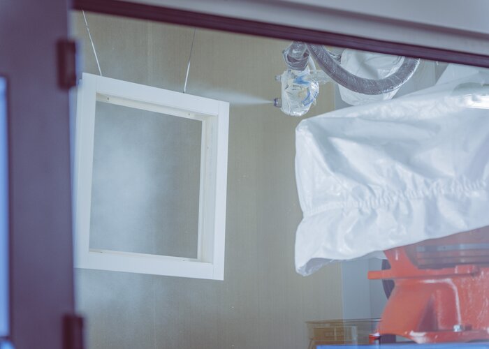 Lakování robotem je zvláště vhodné pro velkoformátové 3D díly, jako jsou dveře nebo okenní rámy, a umožňuje vám vyrábět dřevěné komponenty (např. pro proces výroby nábytku) s trvale vysokou kvalitou povrchu.
