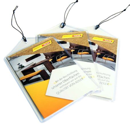 Tyto praktické visačky lze na nábytek připevnit ihned po dokončení V povrhové úpravy vašeho produktu. Visačky jsou opatřeny elastickým gumovým páskem, a proto se snadno připevňují. Brožurky obsahují užitečné pokyny pro péči o olejované, voskované a lakované dřevěné povrchy. Tato čtyřstranná brožurka je malá, přehledná a vzhledově atraktivní. Dotahuje tak každý kus nábytku k dokonalosti nábytku a zároveň předává zákazníkovi důležité informace.
