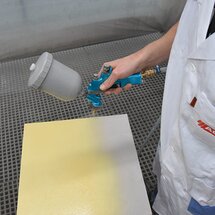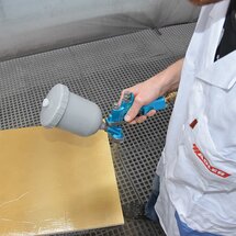 Lak Pigmopur musí nyní schnout při pokojové teplotě po dobu nejméně tří hodin, nejlépe přes noc. Poté následuje lesklá povrchová úprava s ADLER Brilliant-Metallic. Za tímto účelem nastříkejte povrch opatřený základním nátěrem bez mezibroušení s Brilliant Metallic v odstínu Gold. Dbejte na rovnoměrný a tenký nástřik z obou stran.
