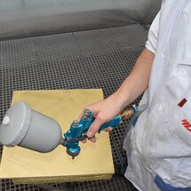 Nyní se aplikuje stříkací pistolí ADLER Pigmopur (G50) v barevném odstínu Gold (zlatá). Tímto krokem dosáhneme optimální kryvosti.