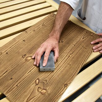 Nyní obruste povrch brusným papírem o zrnitosti 80. Tím vyhladíte hrubý povrch a propůjčíte svému trendovému nábytku také jemnost na pohmat jako u pravého betonu. I zde můžete vytvářet kombinováním růžné intenzity broušení individuální jedinečný vzhled povrchů dle vašich představ.