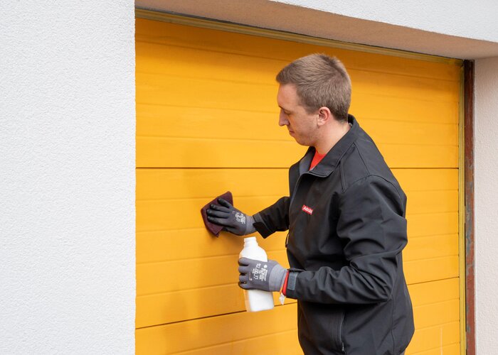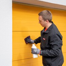 Pro začátek je třeba z garážových vrat odstranit hrubé nečistoty. Pro usnadnění práce použijte ruční kartáč. Potom lze povrch dodatečně očistit odmašťovačem ADLER Entfetter a kouskem brusného rouna pro zvýšení přilnavosti podkladu.