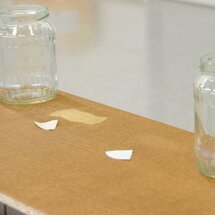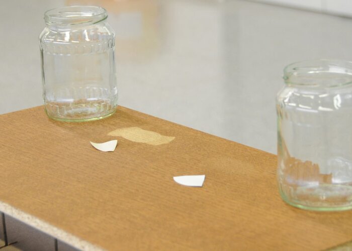 Pod skleničkami se tvoří kruh od vody. V tomto testu jsou tam položeny ještě 2 kusy filtračního papíru, aby byla barviva mořidla viditelná. Bez fixace je obraz moření po několika hodinách narušen.