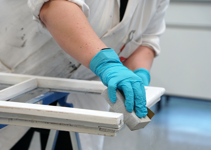 Okenní křídlo a rám zbruste zrnitostí 100-150 (měkké dřevo) nebo 150-180 (tvrdé dřevo) a dobře odstraňte brusný prach.
