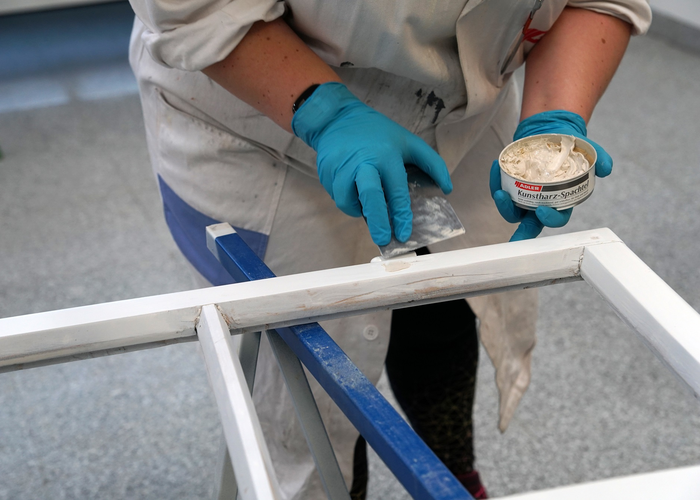 Otevřené spáry a jiná poškození povrchu lze opravit pomocí ADLER Kunstharz-Spachtel. Nechte tmel zaschnout po dobu 16 hodin, poté vybruste do hladka zrnitostí 120.