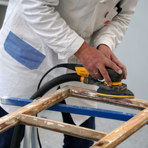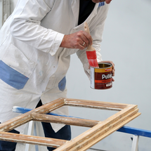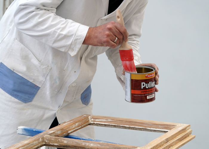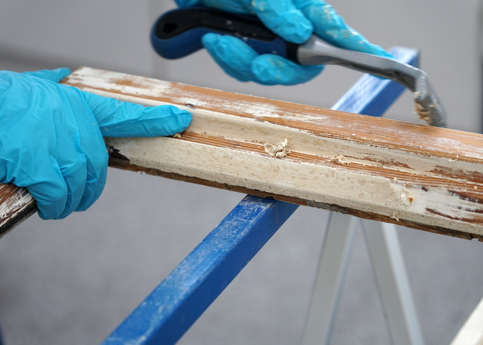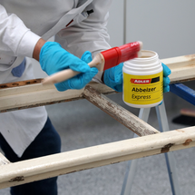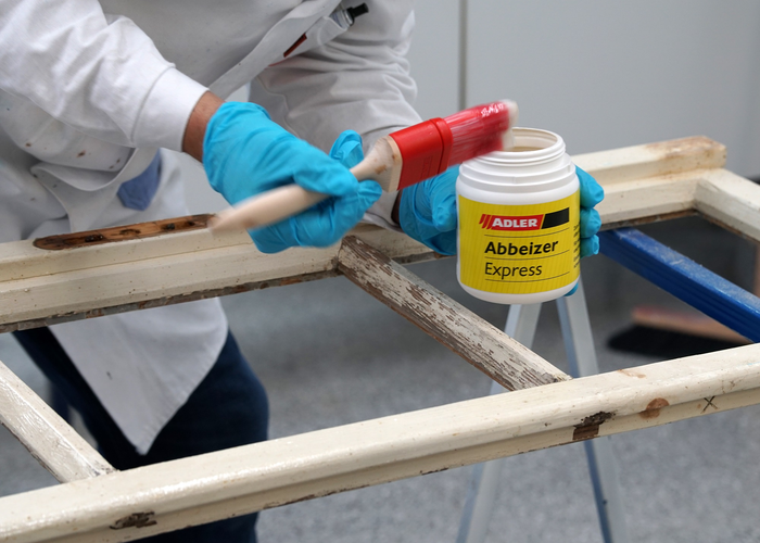 V dalším kroku je třeba co nejdůkladněji odstranit starý nátěr. Pro tento účel naneste štětcem ADLER Abbeizer Express, nechte 30 minut působit a poté odstraňte barvu cidlinou. Alternativně můžete barvu opálit pomocí horkovzdušné pistole.